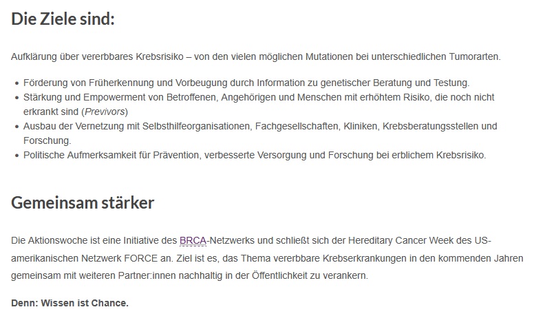 Diese findet im Zeitraum 29.09.2025 bis 05.10.2025 statt und wird vom BRCA-Netzwerk e. V. (ebenfalls Mitglied im Haus der Krebs-Selbsthilfe Bundesverband e. V.) organisiert.